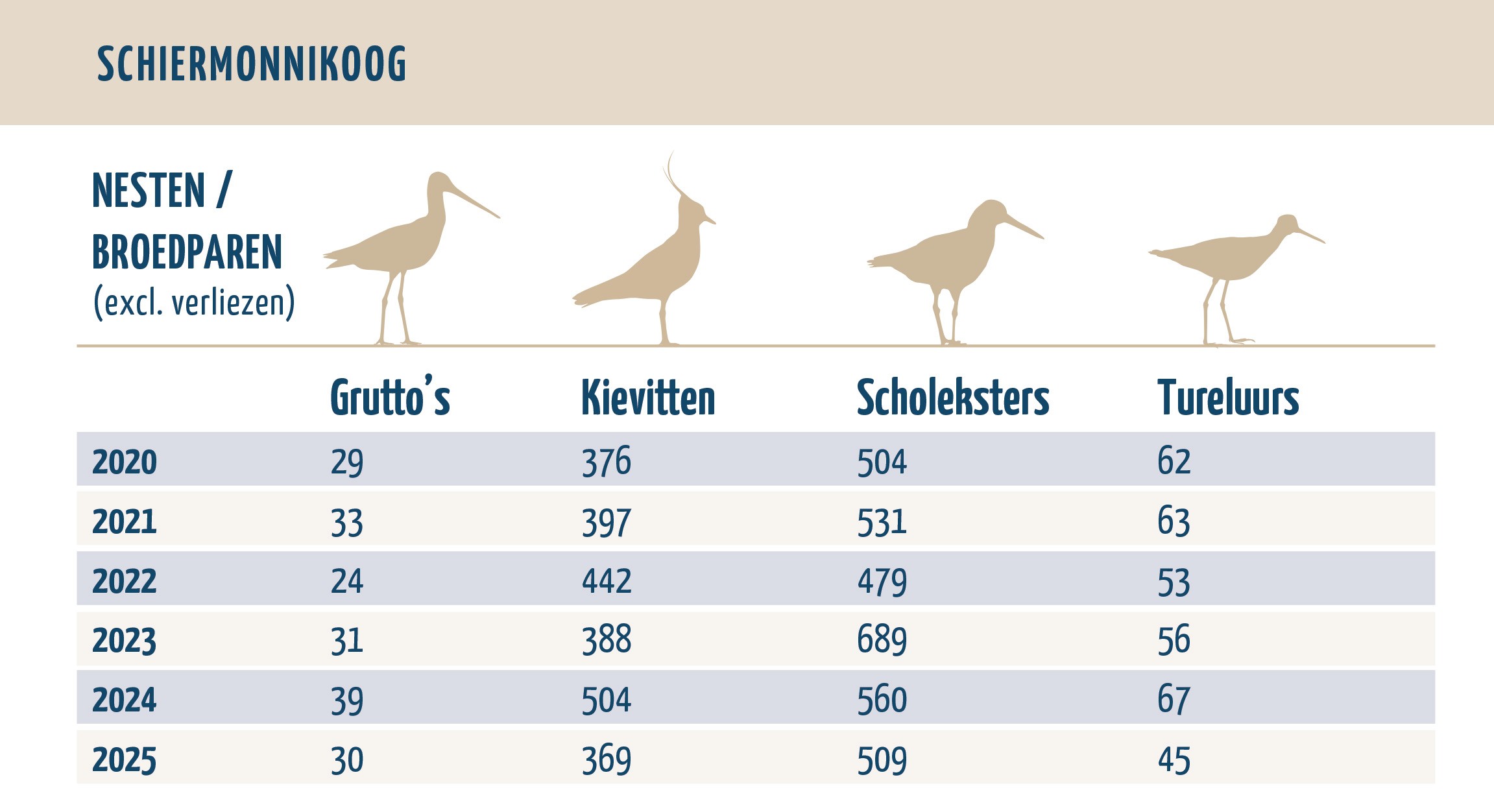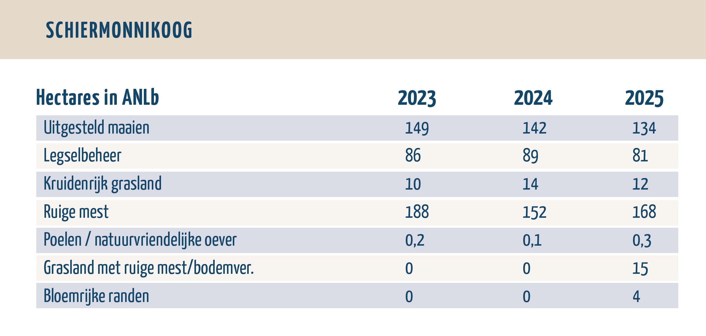 In 2021 besloten de 7 melkveehouders om samen minder vee te gaan houden om zodoende de stikstofneerslag op de omringende natuur te verminderen. Het weidevogelbeheer kenmerkt zich net als op Ameland en Terschelling door een combinatie van nestbeschermende maatregelen, grasland met rustperiode (uitgesteld maaien) en kruidenrijke graslanden. In de tabel hieronder ziet u de jaarlijkse onderverdeling in hectares agrarisch natuurbeheer.