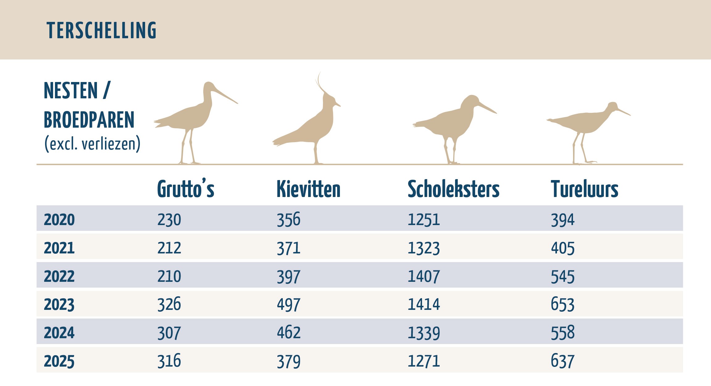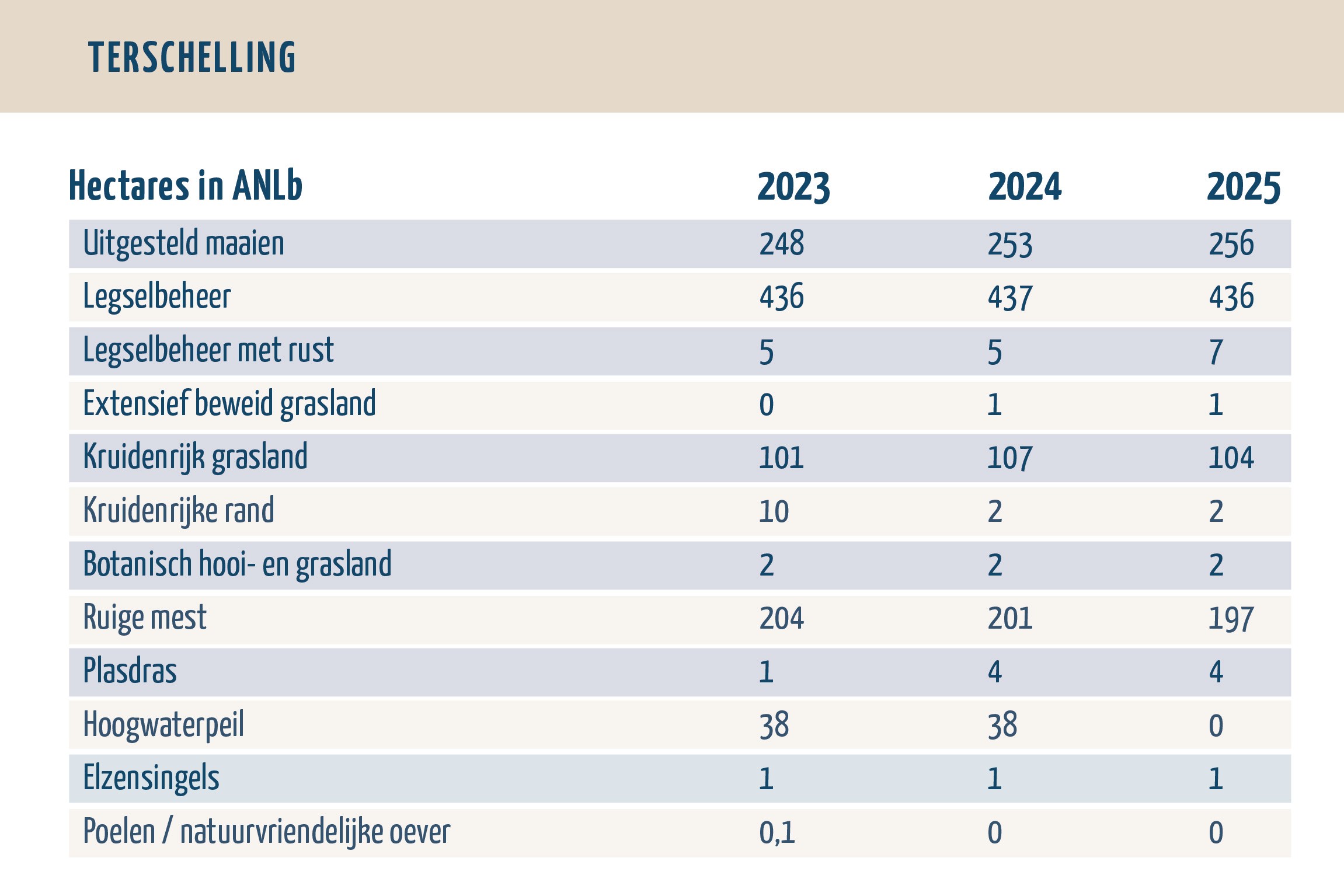 Op Terschelling concentreert de weidevogelbescherming zich in één gebied rond de dorpen. Het gebied is ruim 800 ha groot, dit is geheel in agrarisch natuurbeheer. Net als op Ameland en Schiermonnikoog kenmerkt het weidevogelbeheer zich door een combinatie van nestbeschermende maatregelen, grasland met rustperiode (uitgesteld maaien) en kruidenrijke graslanden. Onderscheidend qua beheer op Terschelling zijn de vele hectares hoogwaterpeil en plasdras wat zeer waardevol is voor het weidevogelbeheer. In de tabel hieronder ziet u de jaarlijkse onderverdeling in hectares agrarisch natuurbeheer.
