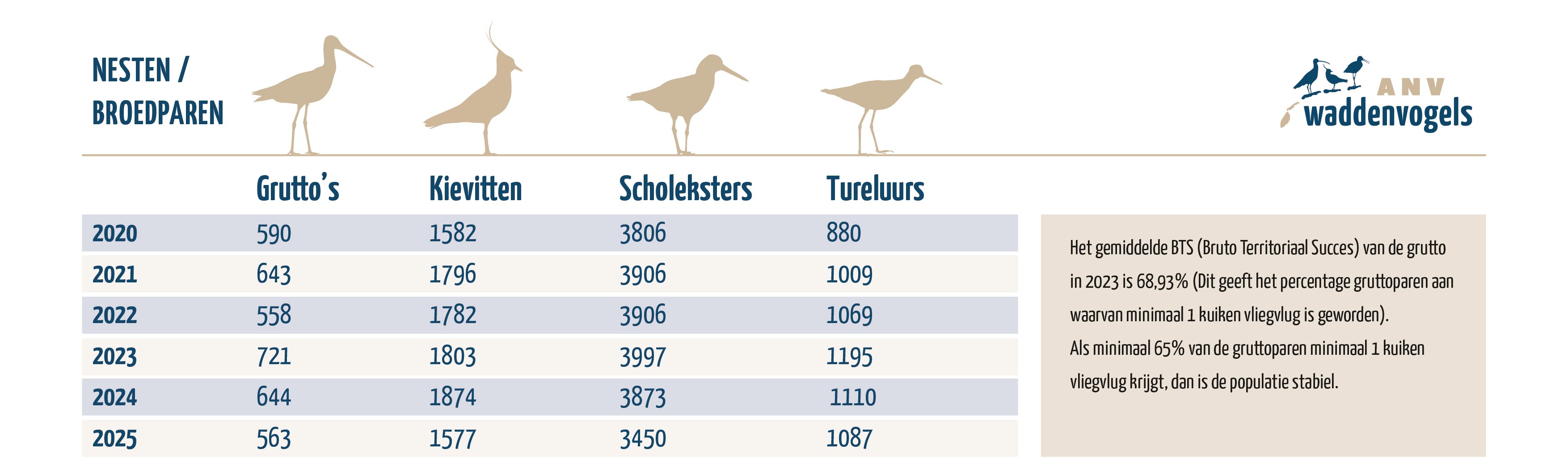 In de tabel hieronder kunt u het jaarlijkse aantal nesten/broedparen van de 3 eilanden samen zien.